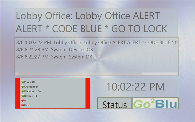 Communicate. Go²Blu excels in communicating a duress alarm event in seconds to emergency response personnel. Using Cauzway wireless fixed or portable duress alert buttons located in critical areas, the moment an alert button is depressed, a pre-defined audio message is delivered over 2-way radio and public address systems.